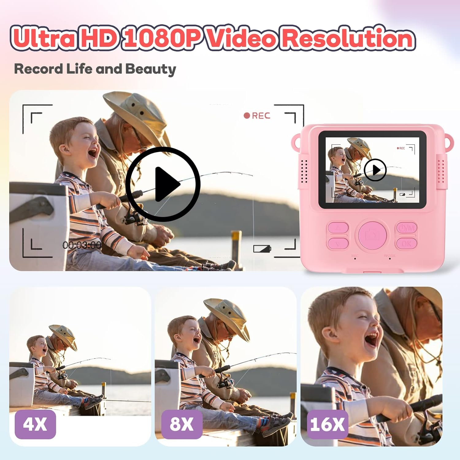 (دوربین اسباب بازی چند منظوره با ضبط) این دوربین فیلمبرداری از ضبط HD 1080P پشتیبانی می کند، با صفحه نمایش بزرگ 2.4 اینچی و زوم دیجیتال 16 برابری، کودکان می توانند دید بزرگتری برای صرفه جویی در وقت گرانبها داشته باشند. یک کارت حافظه 32G از قبل نصب شده است که امکان ذخیره صدها عکس را فراهم می کند.