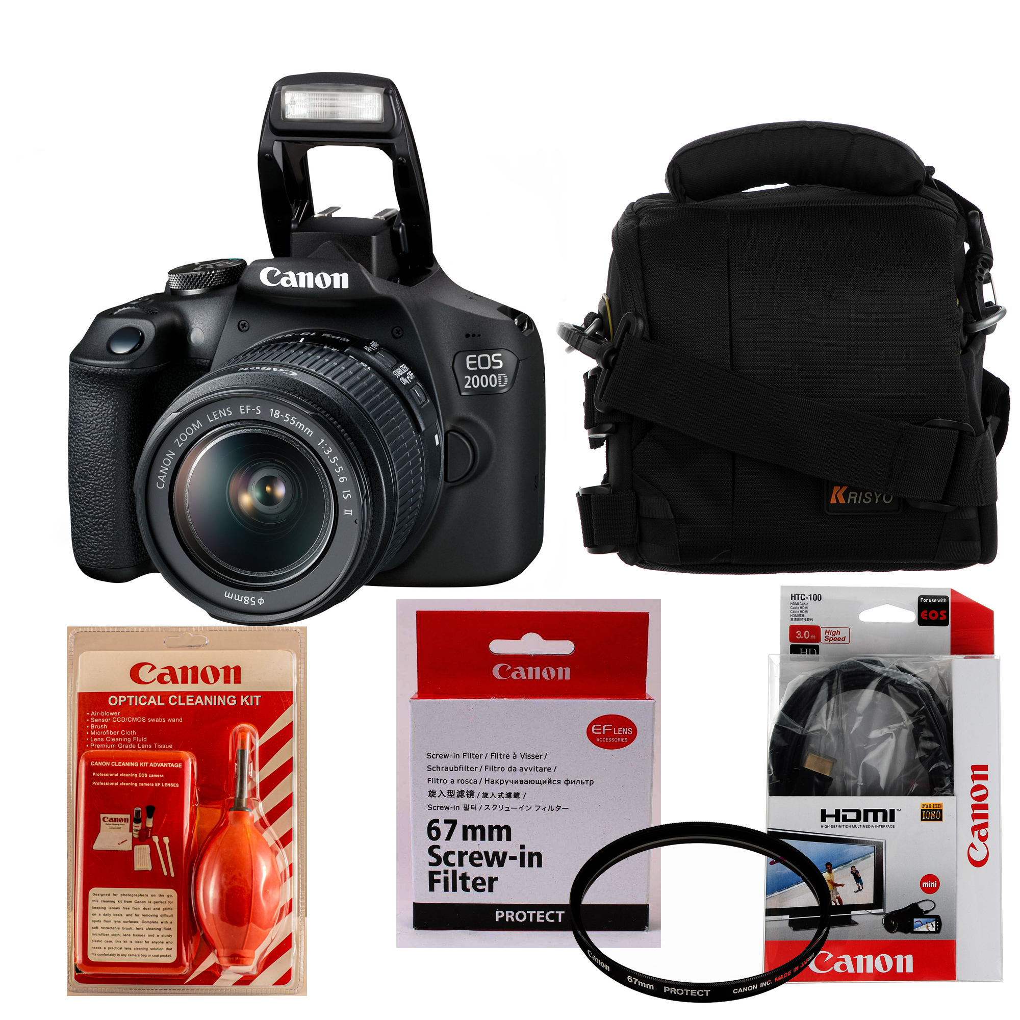 مدل «2000D» در سری دوربینهای مبتدی DSLR کانن قرار میگیرد. این مدل را کمپانی مشهور «کانن» (Canon) تولید کرده است و همراه آن لنز 18-55 میلیمتر ارائه میشود. 18-55 لنز نرمالی است که میتوانید با آن محدودهی قابلقبولی را هنگام عکاسی پوشش داده و عکسهای واضح و باکیفیتی ثبت کنید. برای توضیح دربارهی مشخصات فنی این دوربین باید گفت که 2000D با برخورداری از عالیترین سطح تنظیمات دستی و پیشرفتهترین تکنولوژیهای بهروز دوربینهای دیجیتال و همچنین قیمتی بهصرفه و مناسب، نزد مشتاقان عکاسی و آنان که در ابتدای راه عکاسی حرفهای هستند، از محبوبیت بسیار زیادی برخوردار است. دوربین کانن «EOS 2000D» از حسگر 24.1 مگاپیکسلی CMOS و پردازشگر تصویر +DIGIC 4 بهره میبرد که ترکیب این دو، ثبت تصاویری با کیفیت فوقالعاده را حتی در شرایط نوری ضعیف تضمین خواهد کرد. این دوربین خوشدست، 475 گرم وزن دارد. سمت راست بدنهی این دوربین، یک برآمدگی دارد تا راحتتر در دست جای گیرد. Canon EOS 2000D دارای یک صفحهنمایش LCD در اندازهی سهاینچ با دقت ۹۲۰۰۰۰ نقطه و چشمی اپتیکال است. عکسها و فیلمهای ضبطشدهی این دوربین، روی کارت حافظهی SD ذخیره میشوند. این دوربین قیمتی بهصرفه دارد و کانن با طراحی آن، کاربران مبتدی را نشانه گرفته است تا با استفاده از آن اولین قدم را در دنیای عکاسی بردارند و مهارتهای خود را به چالش بکشند. دوربین 2000D دامنهی حساسیت ۱۰۰-۶۴۰۰ دارد و البته تا ۱۲۸۰۰ هم قابلارتقا است. وجود قابلیت سلفتایمر باعث میشود بتوانید دوربین را در محل دخواه خود قرار داده و بین 2 تا 10 ثانیه بعد به صورت خودکار عکس بگیرد. درمجموع این دوربین برای کاربرانی که تازه عکاسی را شروع میکنند گزینهی مناسبی به حساب میآید.
